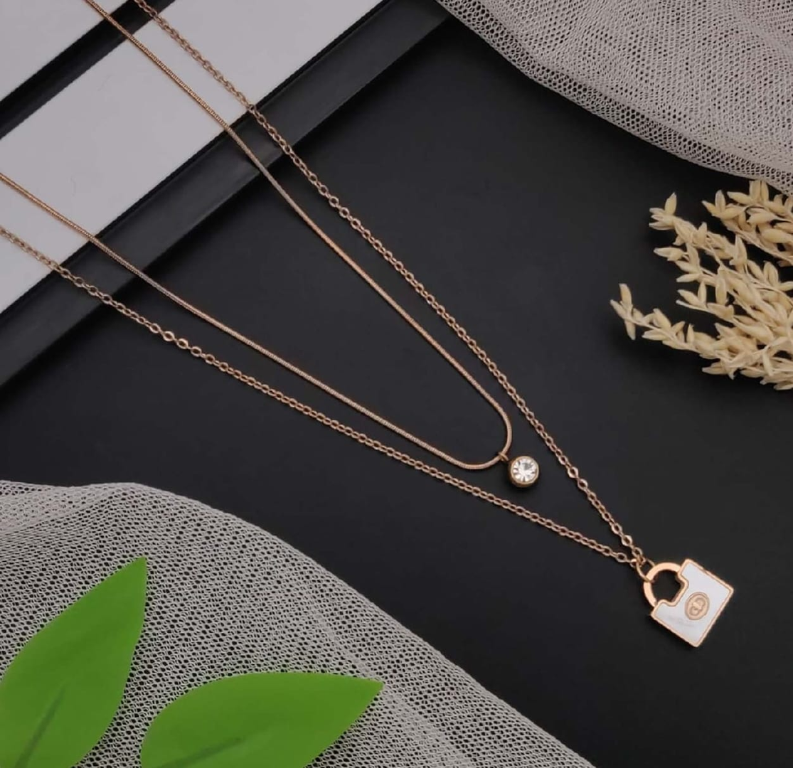18kRose Gold Plated Anti Tarnish Beautiful Double Layered Stone and Lock Pendant-Chain for Daily Wear. Its Skin Friendly and Waterproof.