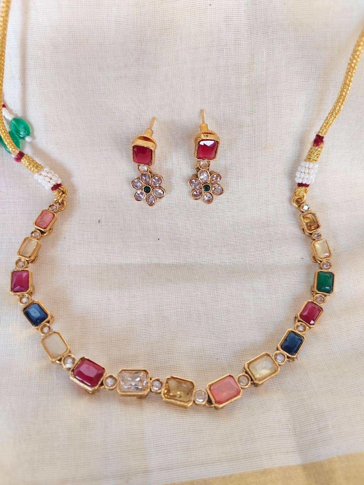 The mesmerizing pattern of Navarathna stones creates an energetic charm that draws attention and admiration. Each gem is thoughtfully arranged to maximize its brilliance, making it the perfect accessory for festive occasions or a touch of elegance in daily wear. The matching earrings enhance the overall appeal, allowing you to shine with confidence.