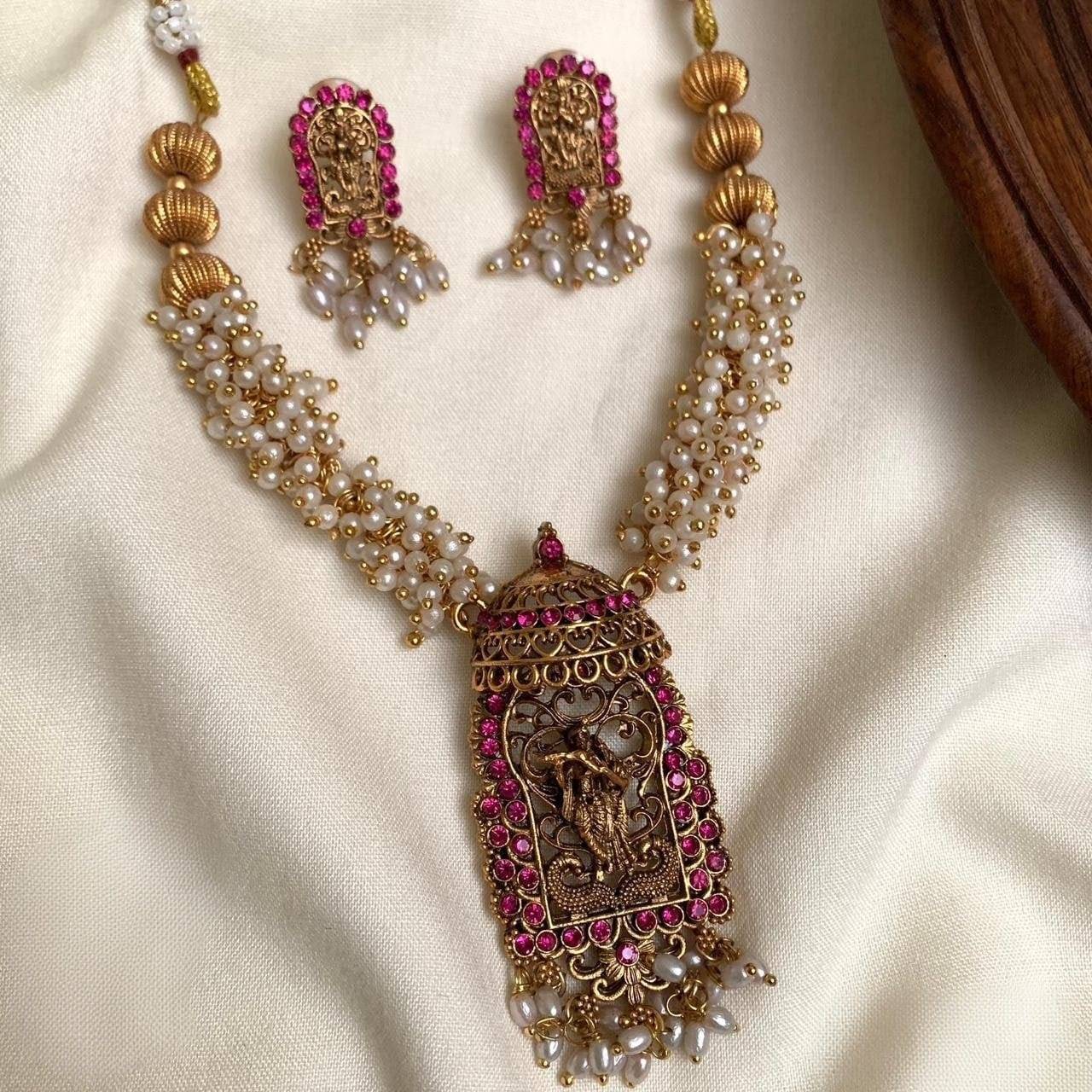 Radhe Krishna Necklace With Ruby Stones and Pearls Necklace with Elegant Earrings Elegant Traditional Wear With Sarees and Salwars Best To gift