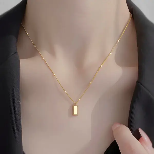 Crafted to perfection, the pendant showcases a polished gold finish that not only catches the light beautifully but also resists tarnishing, ensuring your necklace stays radiant for years to come. The minimalist rectangular pattern adds a touch of modern elegance, making it a must-have for trendsetters and fashion enthusiasts alike.